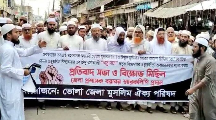 মহানবী (স.) এর অবমাননার প্রতিবাদে ভোলা মুসলিম ঐক্য পরিষদের বিক্ষোভ মিছিল ও স্মারকলিপি প্রদান