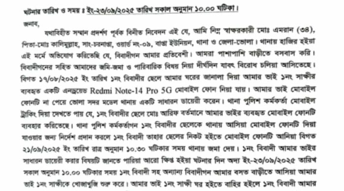 গত ৩ সেপ্টেম্বর ২০২৫ ইং তারিখে দৈনিক অনলাইন পত্রিকা ভোলা প্রকাশ, মাতৃভূমির কথা ও আজকের দেশবনী পত্রিকায়”৫ লক্ষ টাকা চাদা না দেওয়ায় বসতবাড়ির রাস্তা বন্ধ করে দিলেন ওয়াসিম ও মিলনগংরা”