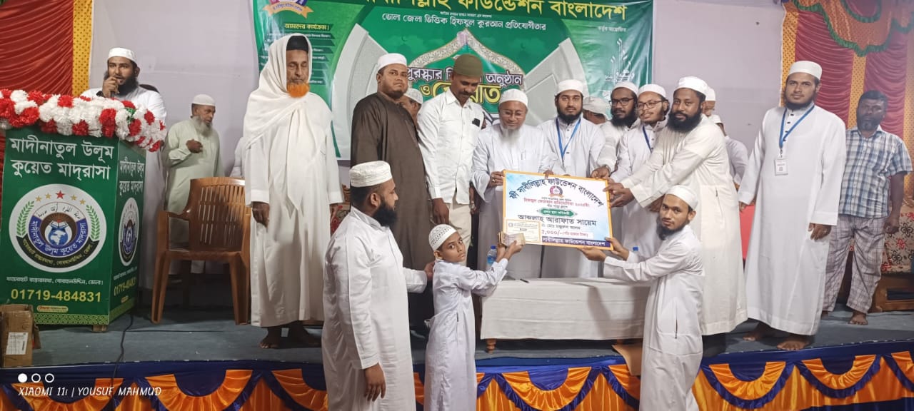 আল্লাহর কালাম কুরআনুল কারিমের হিফজ ও প্রচারে নিবেদিত সংগঠন ফি সাবিলিল্লাহ ফাউন্ডেশন বাংলাদেশ আয়োজিত জেলা ভিত্তিক হিফজুল কুরআন প্রতিযোগিতার ফাইনাল পর্ব ও পুরস্কার বিতরণী অনুষ্ঠান শনিবার অনুষ্ঠিত হয় মাদীনাতুল উলুম কুয়েত মাদরাসা, খায়েরহাটে।